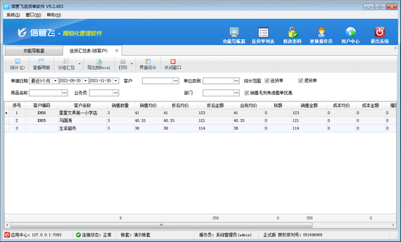 信管飛送貨單軟件為集訂單管理、送貨管理、收款結(jié)算等功能并支持送貨明細對賬及業(yè)務(wù)綜合對賬的送貨單打印軟件。軟件根據(jù)錄入的每張訂單及送貨單等數(shù)據(jù),可以自動生成統(tǒng)計報表,完成企業(yè)銷售統(tǒng)計查詢和與客戶送貨明細對賬的目的,如下圖所示。 其中,送貨匯總表(按客戶)可根據(jù)單據(jù)日期、客戶名稱、商品名稱等查詢條件,統(tǒng)計銷售給每個客戶的商品匯總