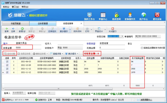 信管飛送貨單軟件是集送貨開單、打印和應(yīng)收款管理為一體的軟件,送貨單確認(rèn)開單后自動(dòng)生成對(duì)應(yīng)的一筆應(yīng)收款,有客戶存在分批付款情況,針對(duì)此情況軟件支持對(duì)應(yīng)收款進(jìn)行批量結(jié)銷。本文示范下如何批量結(jié)銷應(yīng)收款。 在功能導(dǎo)航窗點(diǎn)擊“業(yè)務(wù)處理”—》“應(yīng)收款管理”,選擇一筆未結(jié)銷的應(yīng)收款點(diǎn)擊“收款結(jié)算”,會(huì)彈出收款結(jié)算單