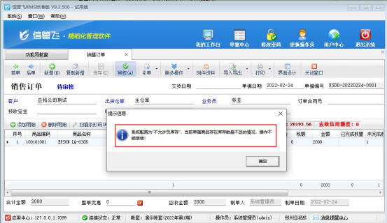 信管飛RMS軟件、信管飛倉庫管理軟件支持管理商品庫存,商品進出庫單據審核后庫存自動增減,默認開單允許負庫存出庫,有用戶需要下銷售訂單時負庫存無法下單的情況,本文以“信管飛RMS軟件”,示范下如何設置銷售訂單負庫存不能審核。 在功能導航窗點擊“系統管理”—》“系統參數配置”選擇“業務參數”,找到參數“銷
